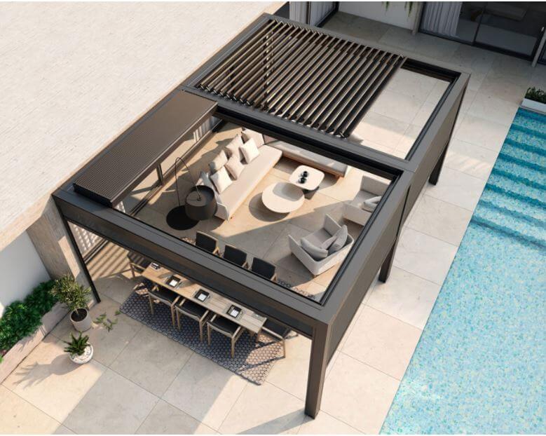 Naast functionaliteit biedt de pergola ook luxe in de details. Zo beschikt het systeem over geïntegreerde LED-verlichting in het frame, wat zowel binnen als buiten de overkapping zorgt voor een warme, uitnodigende sfeer. Voeg daar optionele zijwanden, screens of glazen schuifwanden aan toe, en je creëert een volledig afgeschermde, comfortabele buitenkamer.