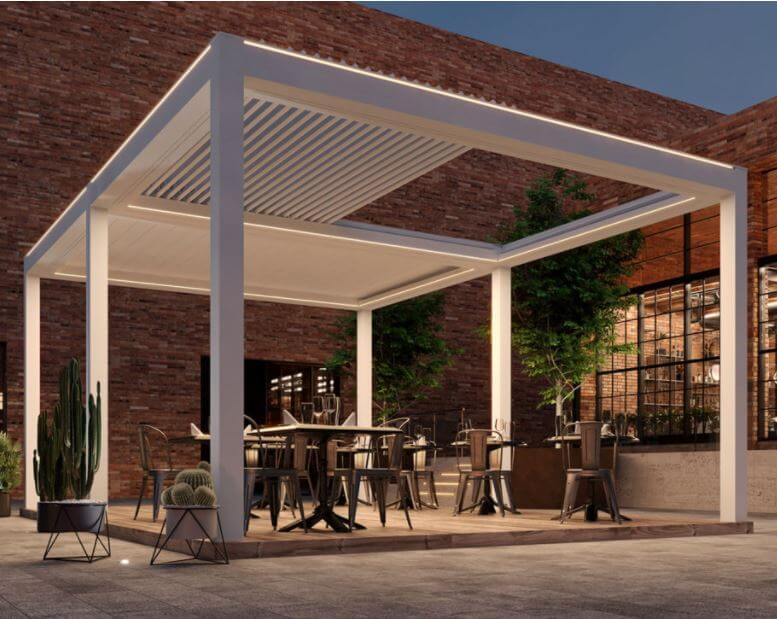 Tegen de gevel of vrijstaand, zowel residentiële als commerciële omgevingen, volledig op maat, stel je de overkapping volledig af op jouw wensen. Zowel binnen als buiten de pergola is er een aangename verlichting mogelijk dankzij een LED-verlichtingssysteem dat in het frame van de pergola is geïntegreerd.